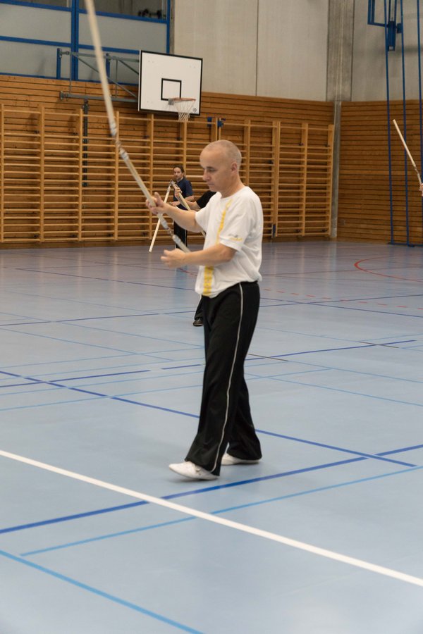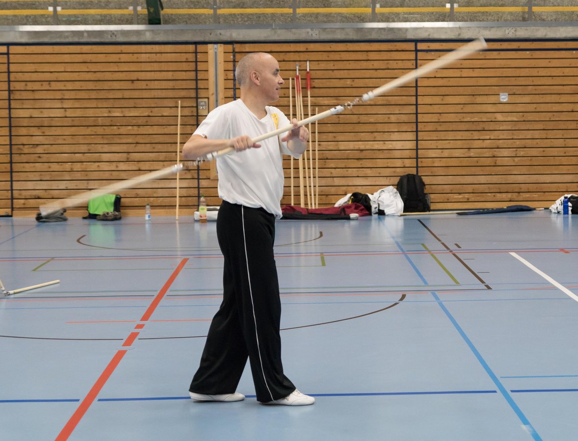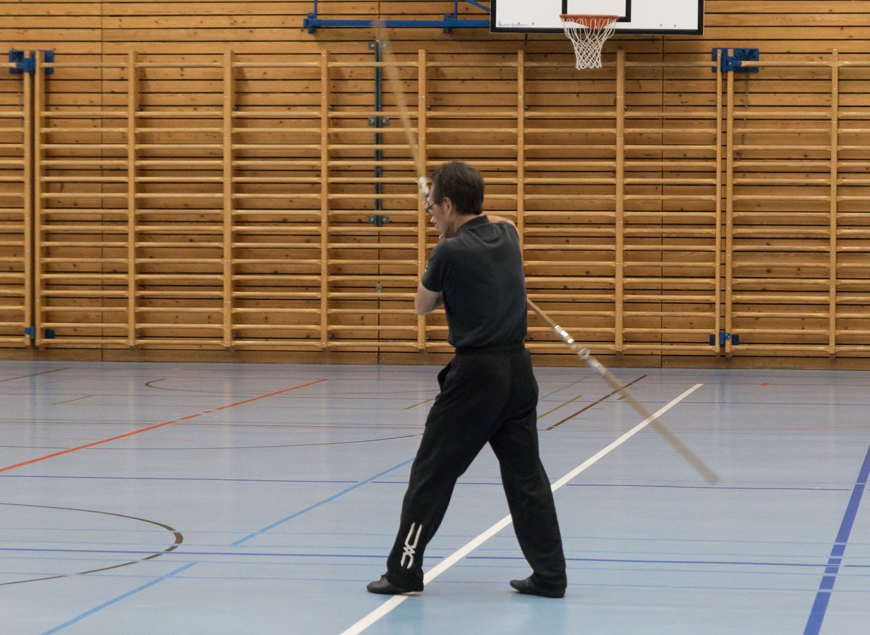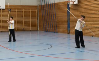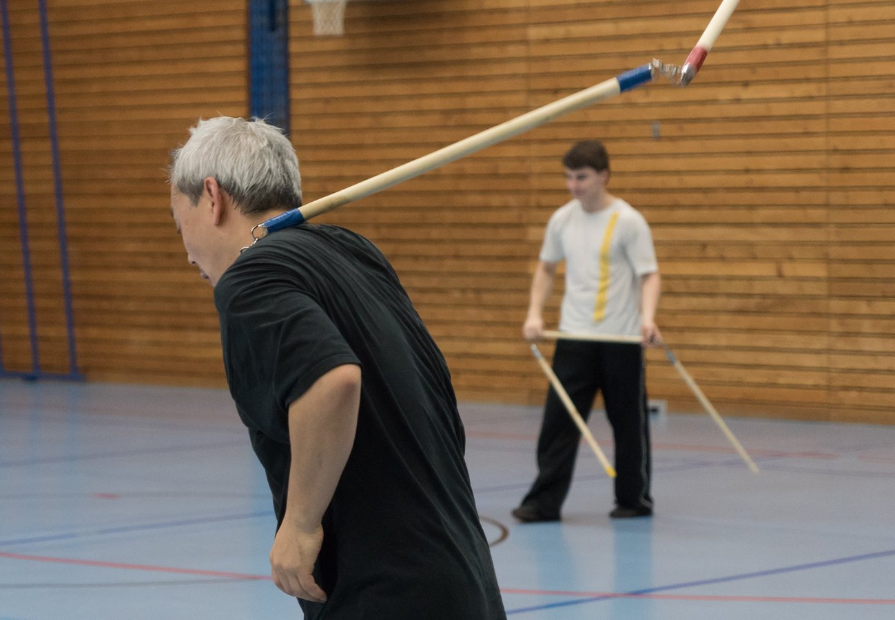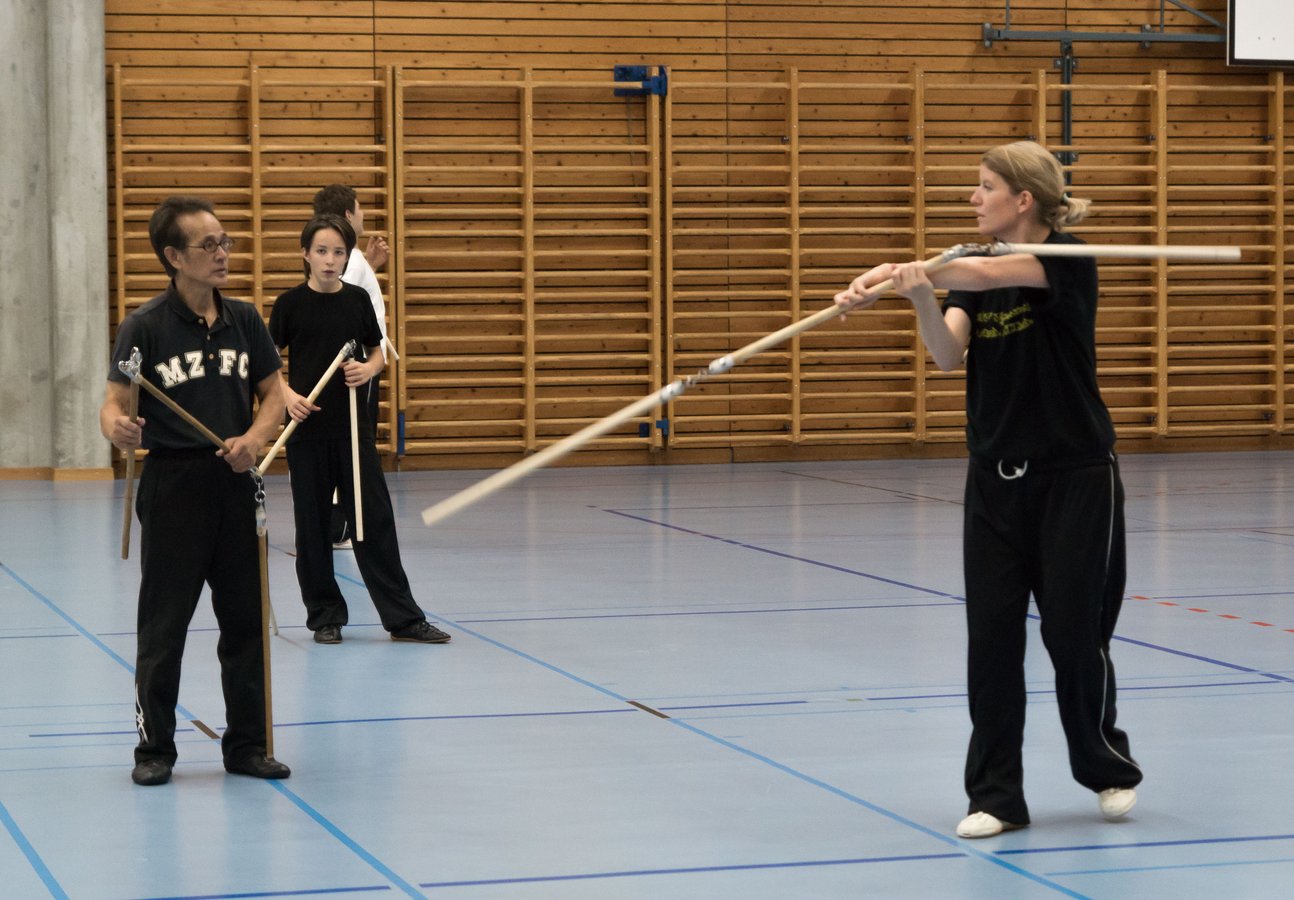 Das eigentliche Highlight - für die Teilnehmenden auf jeden Fall - war dieses Jahr jedoch das Seminar vom Abend für Jugendliche und Erwachsene, welches von Lehrer Yu selber geleitet worden ist: Das Seminar mit Sanjiegun, dem dreiteiligen Stock. Diese Waffe war zu seiner Aktivzeit eine seiner ganz grossen Stärken. Allerdings, alle, die dabei waren, werden Mühe damit haben, wenn ich hier die Vergangenheit bemühe, denn Lehrer Yu hüpfte mit dieser spektakulären Waffe eine Woche lang durch die Halle, als gäbe es für ihn kein Altern. Die Sicherheit, mit der er dieser Waffe führt und selbst die Geschwindigkeit waren für alle beeindruckend. Lehrer Yu ist ein begnadeter Lehrer, der sich Zeit nimmt und wirklich versucht, sein Wissen weiter zu geben, so dass zum Schluss alle zufrieden sind, weil sie spür- und sichtbar Fortschritte machen. Unsere SchülerInnen sind immer mit viel Engagement im Training dabei, aber in diesem Seminar haben sie noch mehr Gas gegeben als sonst schon. Kaum jemand wollte mal Pause machen, obwohl die Waffe sehr anstrengend ist (jaja, das sieht von aussen - vor allem bei Lehrer Yu - natürlich ganz anders aus). Dazu kam, dass niemand die Woche überstanden hat, in der er sich dieses wilde Ding nicht einmal irgendwo an den Kopf oder an ein Schienbein geschlagen hat. Dabei sagte doch Lehrer Yu noch: Diese Waffe sei, wie alle andern auch, dafür gedacht, den Gegner zu schlagen. Allerdings müsse man schon sehr aufpassen, dass man damit nicht sich selber schlage. Wie Recht er doch hatte. Aber alle haben sich als zähe SportlerInnen mit Nehmerqualitäten gezeigt.