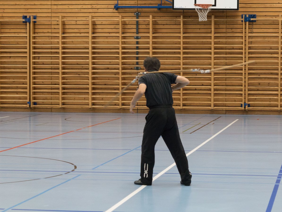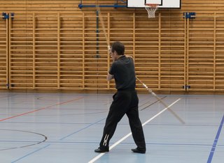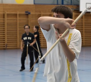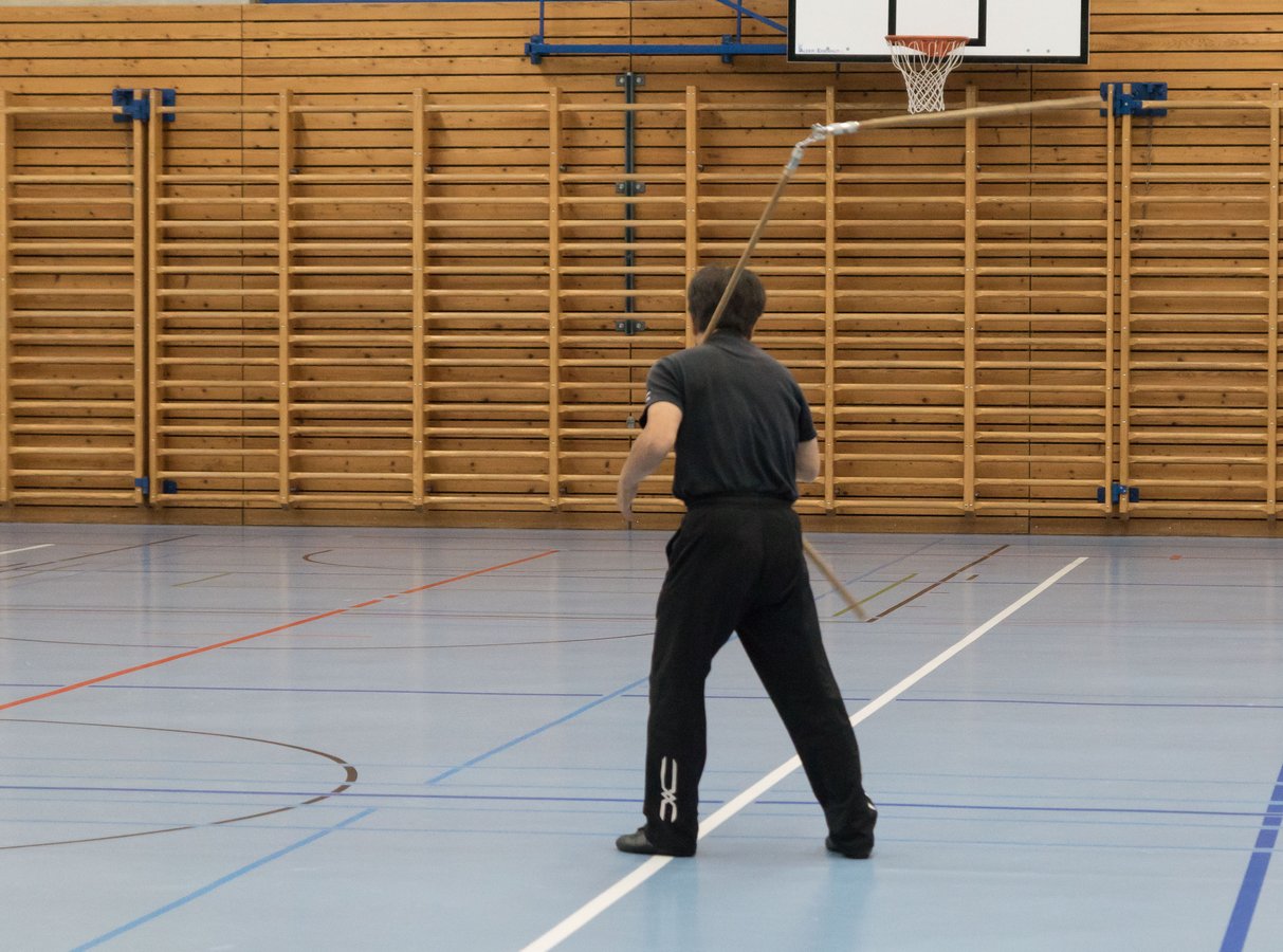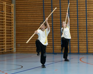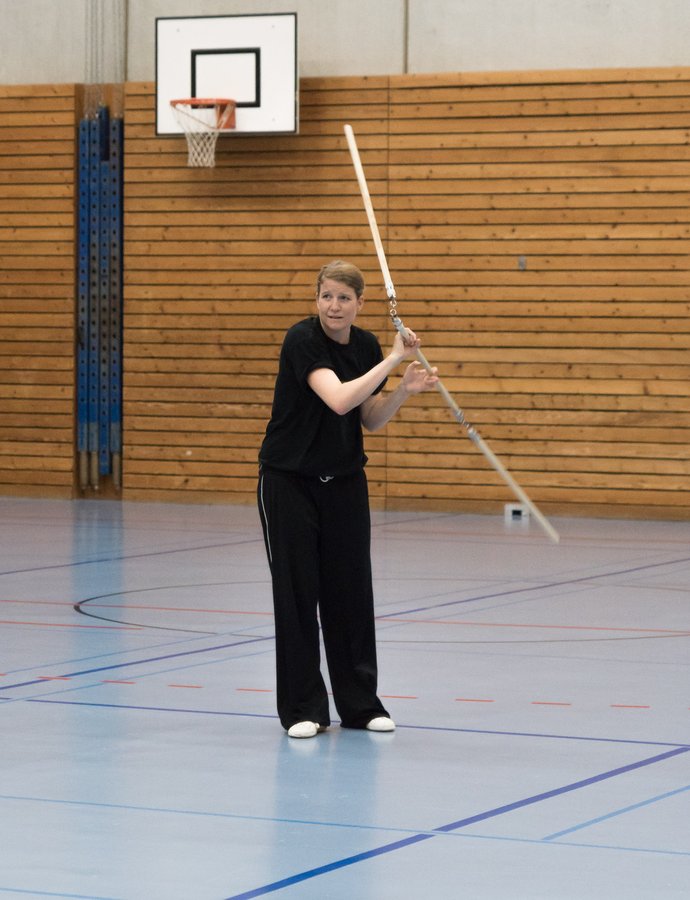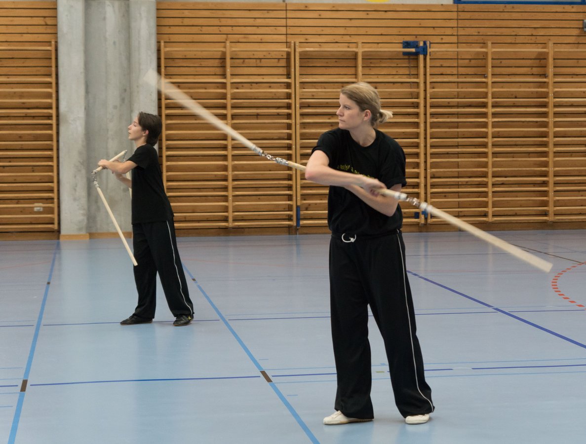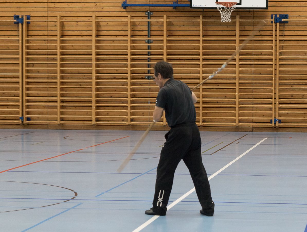 Das eigentliche Highlight - für die Teilnehmenden auf jeden Fall - war dieses Jahr jedoch das Seminar vom Abend für Jugendliche und Erwachsene, welches von Lehrer Yu selber geleitet worden ist: Das Seminar mit Sanjiegun, dem dreiteiligen Stock. Diese Waffe war zu seiner Aktivzeit eine seiner ganz grossen Stärken. Allerdings, alle, die dabei waren, werden Mühe damit haben, wenn ich hier die Vergangenheit bemühe, denn Lehrer Yu hüpfte mit dieser spektakulären Waffe eine Woche lang durch die Halle, als gäbe es für ihn kein Altern. Die Sicherheit, mit der er dieser Waffe führt und selbst die Geschwindigkeit waren für alle beeindruckend. Lehrer Yu ist ein begnadeter Lehrer, der sich Zeit nimmt und wirklich versucht, sein Wissen weiter zu geben, so dass zum Schluss alle zufrieden sind, weil sie spür- und sichtbar Fortschritte machen. Unsere SchülerInnen sind immer mit viel Engagement im Training dabei, aber in diesem Seminar haben sie noch mehr Gas gegeben als sonst schon. Kaum jemand wollte mal Pause machen, obwohl die Waffe sehr anstrengend ist (jaja, das sieht von aussen - vor allem bei Lehrer Yu - natürlich ganz anders aus). Dazu kam, dass niemand die Woche überstanden hat, in der er sich dieses wilde Ding nicht einmal irgendwo an den Kopf oder an ein Schienbein geschlagen hat. Dabei sagte doch Lehrer Yu noch: Diese Waffe sei, wie alle andern auch, dafür gedacht, den Gegner zu schlagen. Allerdings müsse man schon sehr aufpassen, dass man damit nicht sich selber schlage. Wie Recht er doch hatte. Aber alle haben sich als zähe SportlerInnen mit Nehmerqualitäten gezeigt.