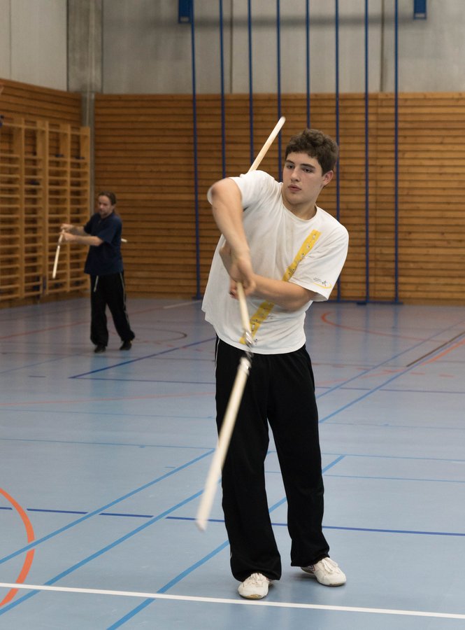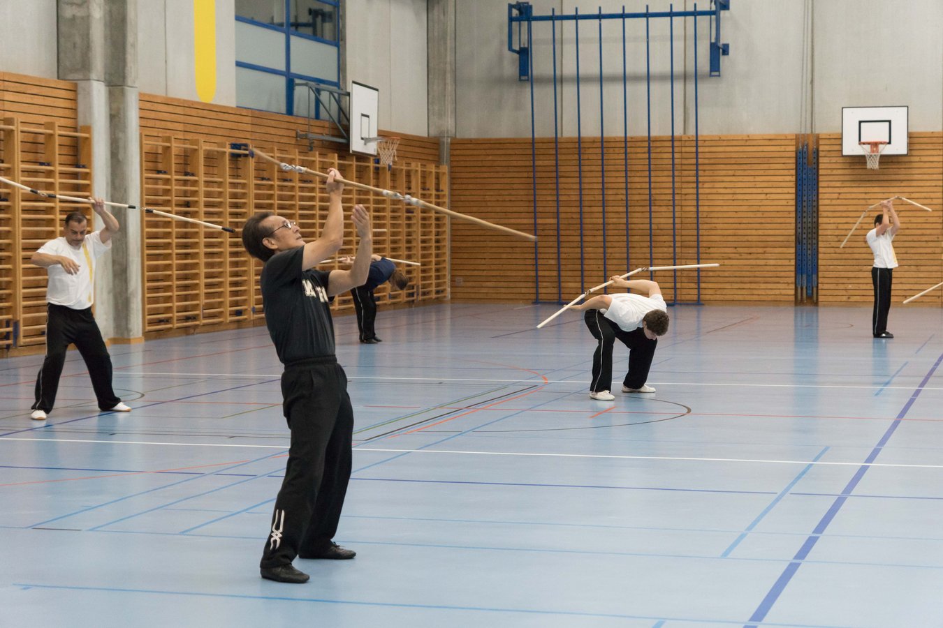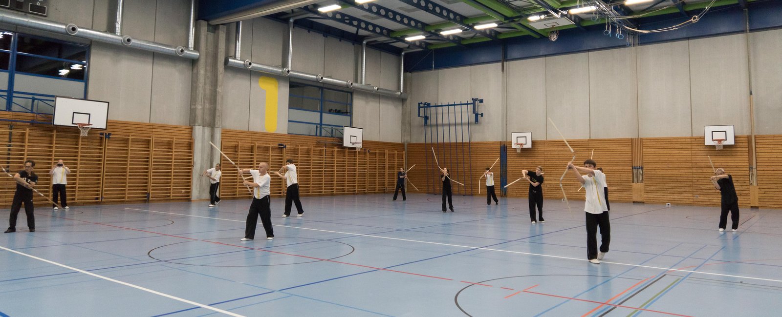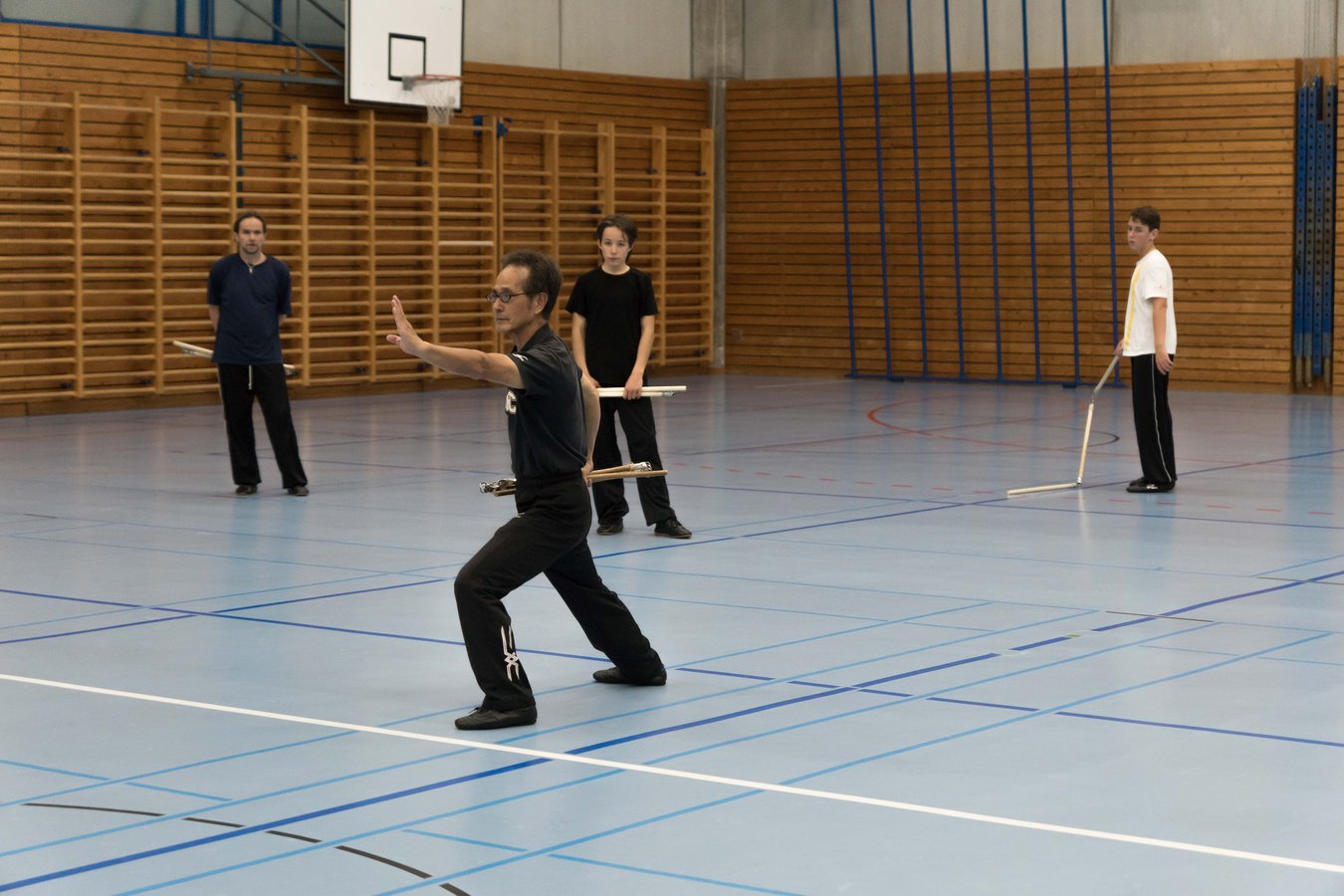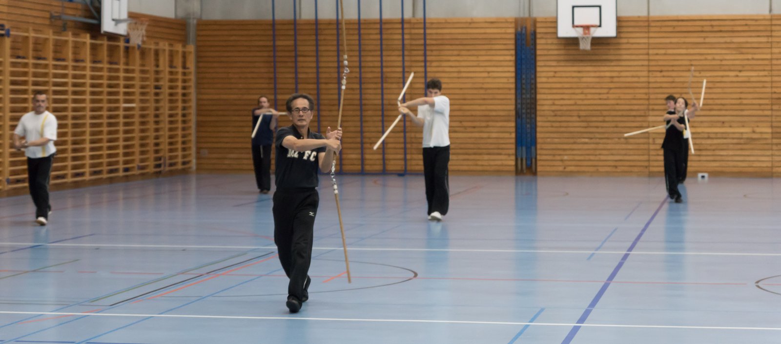 Das eigentliche Highlight - für die Teilnehmenden auf jeden Fall - war dieses Jahr jedoch das Seminar vom Abend für Jugendliche und Erwachsene, welches von Lehrer Yu selber geleitet worden ist: Das Seminar mit Sanjiegun, dem dreiteiligen Stock. Diese Waffe war zu seiner Aktivzeit eine seiner ganz grossen Stärken. Allerdings, alle, die dabei waren, werden Mühe damit haben, wenn ich hier die Vergangenheit bemühe, denn Lehrer Yu hüpfte mit dieser spektakulären Waffe eine Woche lang durch die Halle, als gäbe es für ihn kein Altern. Die Sicherheit, mit der er dieser Waffe führt und selbst die Geschwindigkeit waren für alle beeindruckend. Lehrer Yu ist ein begnadeter Lehrer, der sich Zeit nimmt und wirklich versucht, sein Wissen weiter zu geben, so dass zum Schluss alle zufrieden sind, weil sie spür- und sichtbar Fortschritte machen. Unsere SchülerInnen sind immer mit viel Engagement im Training dabei, aber in diesem Seminar haben sie noch mehr Gas gegeben als sonst schon. Kaum jemand wollte mal Pause machen, obwohl die Waffe sehr anstrengend ist (jaja, das sieht von aussen - vor allem bei Lehrer Yu - natürlich ganz anders aus). Dazu kam, dass niemand die Woche überstanden hat, in der er sich dieses wilde Ding nicht einmal irgendwo an den Kopf oder an ein Schienbein geschlagen hat. Dabei sagte doch Lehrer Yu noch: Diese Waffe sei, wie alle andern auch, dafür gedacht, den Gegner zu schlagen. Allerdings müsse man schon sehr aufpassen, dass man damit nicht sich selber schlage. Wie Recht er doch hatte. Aber alle haben sich als zähe SportlerInnen mit Nehmerqualitäten gezeigt.