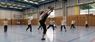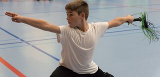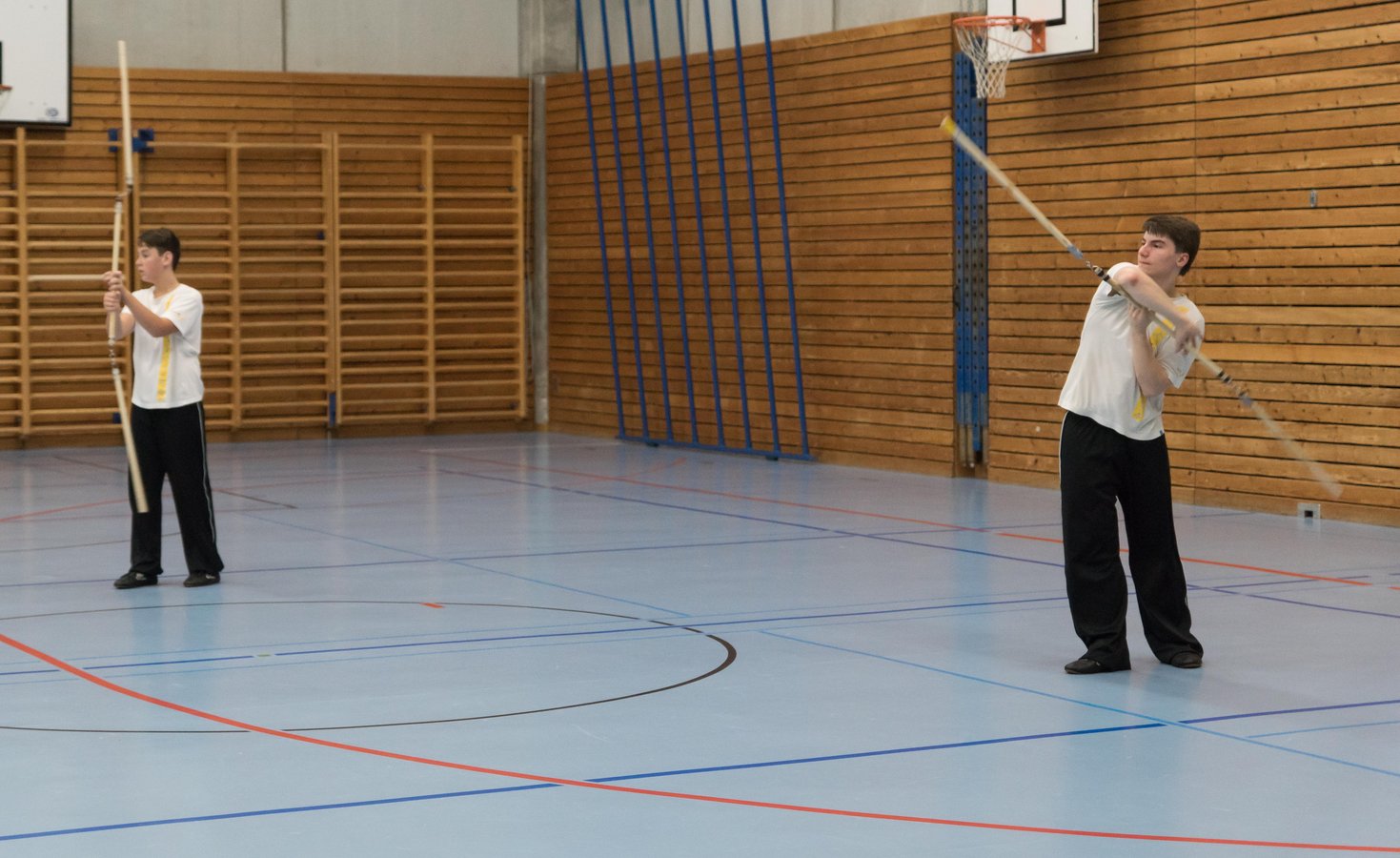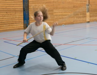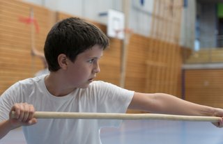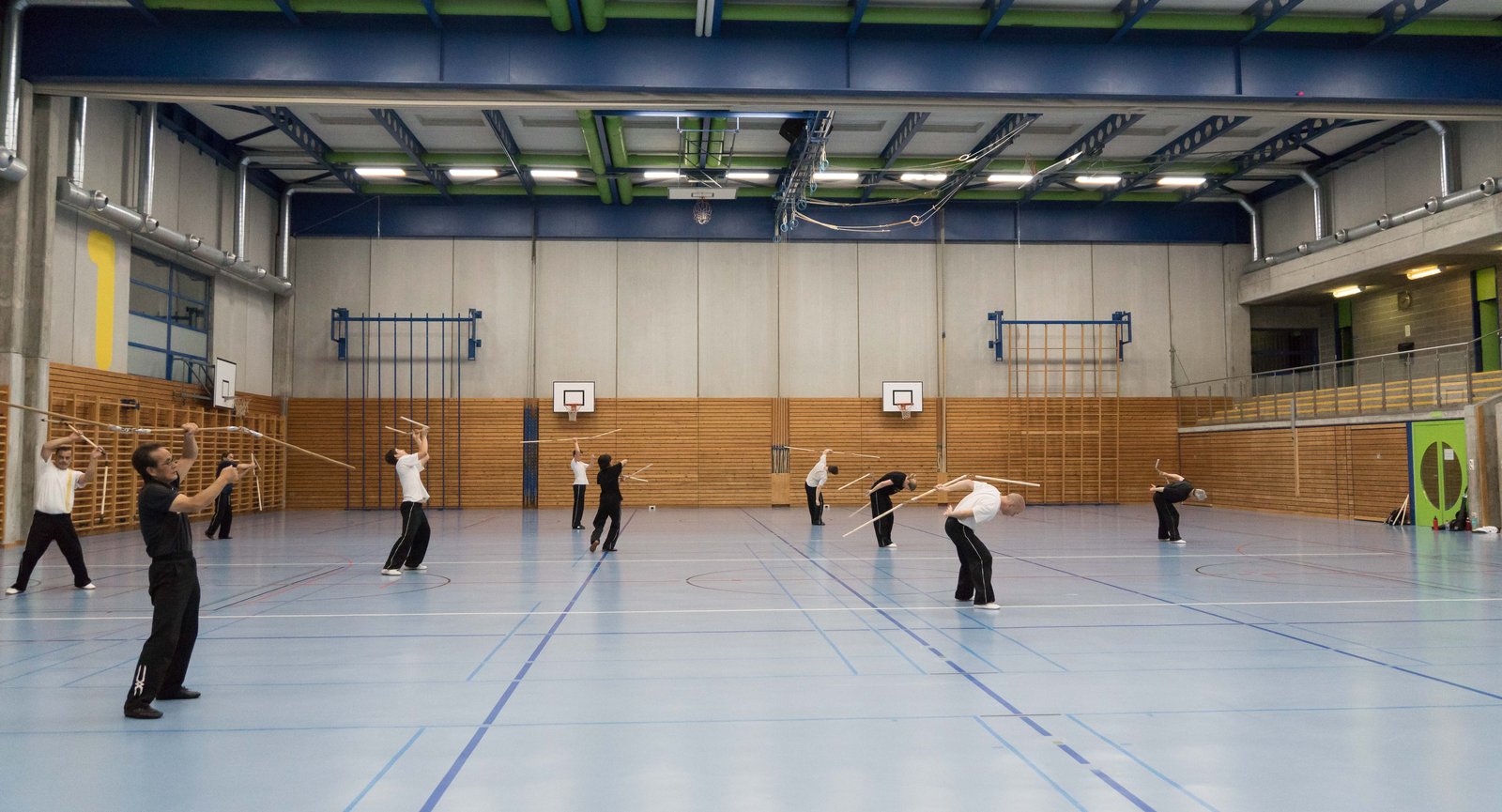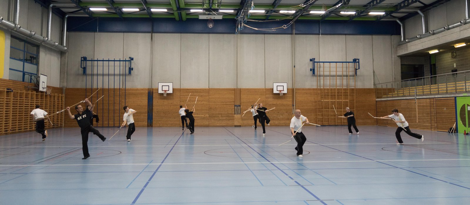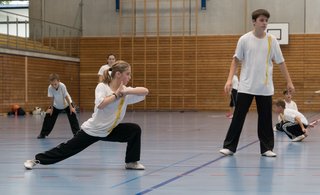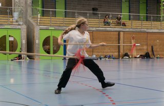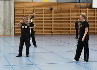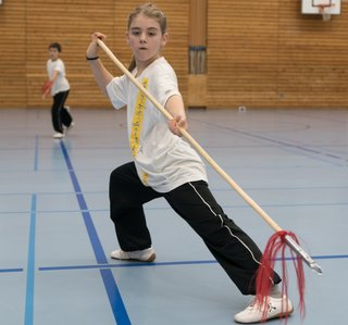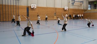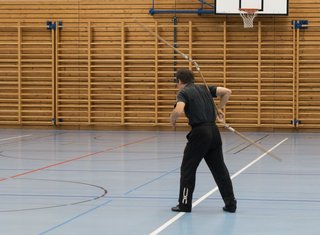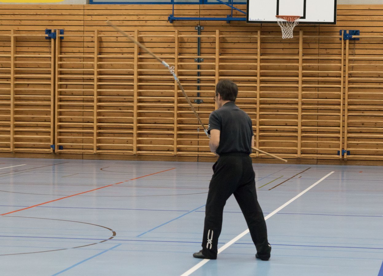Das eigentliche Highlight - für die Teilnehmenden auf jeden Fall - war dieses Jahr jedoch das Seminar vom Abend für Jugendliche und Erwachsene, welches von Lehrer Yu selber geleitet worden ist: Das Seminar mit Sanjiegun, dem dreiteiligen Stock. Diese Waffe war zu seiner Aktivzeit eine seiner ganz grossen Stärken. Allerdings, alle, die dabei waren, werden Mühe damit haben, wenn ich hier die Vergangenheit bemühe, denn Lehrer Yu hüpfte mit dieser spektakulären Waffe eine Woche lang durch die Halle, als gäbe es für ihn kein Altern. Die Sicherheit, mit der er dieser Waffe führt und selbst die Geschwindigkeit waren für alle beeindruckend. Lehrer Yu ist ein begnadeter Lehrer, der sich Zeit nimmt und wirklich versucht, sein Wissen weiter zu geben, so dass zum Schluss alle zufrieden sind, weil sie spür- und sichtbar Fortschritte machen. Unsere SchülerInnen sind immer mit viel Engagement im Training dabei, aber in diesem Seminar haben sie noch mehr Gas gegeben als sonst schon. Kaum jemand wollte mal Pause machen, obwohl die Waffe sehr anstrengend ist (jaja, das sieht von aussen - vor allem bei Lehrer Yu - natürlich ganz anders aus). Dazu kam, dass niemand die Woche überstanden hat, in der er sich dieses wilde Ding nicht einmal irgendwo an den Kopf oder an ein Schienbein geschlagen hat. Dabei sagte doch Lehrer Yu noch: Diese Waffe sei, wie alle andern auch, dafür gedacht, den Gegner zu schlagen. Allerdings müsse man schon sehr aufpassen, dass man damit nicht sich selber schlage. Wie Recht er doch hatte. Aber alle haben sich als zähe SportlerInnen mit Nehmerqualitäten gezeigt.