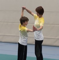 Hier ist sie also, wenn auch erst von hinten: Zhangshuai, für drei Monate auf dem Kommandoposten für alle Talentgruppen an der Wushu Akademie Schweiz.Sie ist der Chef.Sie hat den Überblick......zeigt, wo es langgeht......schaut ganz genau hin......korrigiert und muntert auf......und erklärt gerne auch mal unter Zuhilfenahme von Zeichen.Wir zeigen hier Ausschnitte aus einem normalen Training. Zhangshuai hat natürlich viel mehr Zeit zur Verfügung (bis zu 14 h pro Woche trainieren die AthletInnen) und verwendet sehr viel Zeit auf das Dehnen. Glücklich, wer es mit einem, wenn auch leicht gepressten Lächeln nehmen kann, wie Sheryl.Auch Alessia, die nur schon in diesen ersten vier Wochen grosse Fortschritte gemacht hat, scheint den Druck von Michi relativ gelassen zu nehmen. Diese Stellung an der Wand, welche kein Ausweichen erlaubt, ist auch mental eine grosse Belastung.Zhangshuai widmet sich hier Nina, einer echten Kämpfernatur.Selbst die Kinder verstehen langsam, dass Dehnen einfach ein gewisses Mass an Schmerzenaushalten bedeutet. Tim ist einer der dehnbarsten Jungs, die wir haben, aber auch bei ihm muss man nun, da die Pubertät eingesetzt hat, dagegen halten, denn gerade in dieser Zeit braucht es überproportional viel Dehnen, um den Zustand nur schon halten zu können.Obwohl nun praktisch unten im Spagat scheint er es jetzt entspannter zu nehmen...Schwerstarbeit.Dehnen für Fortgeschrittene.Berühmt-berüchtigt, schon von Zhangshuais ersten Aufenthalten her: Die Brücke.Wir befinden uns im »jibengong«, dem Grundschultraining. Dabei packt unsere chinesische Trainerin immer wieder an und leitet Bewegungen in die richtige Richtung.»Schön aufrecht bleiben, Nina!«.